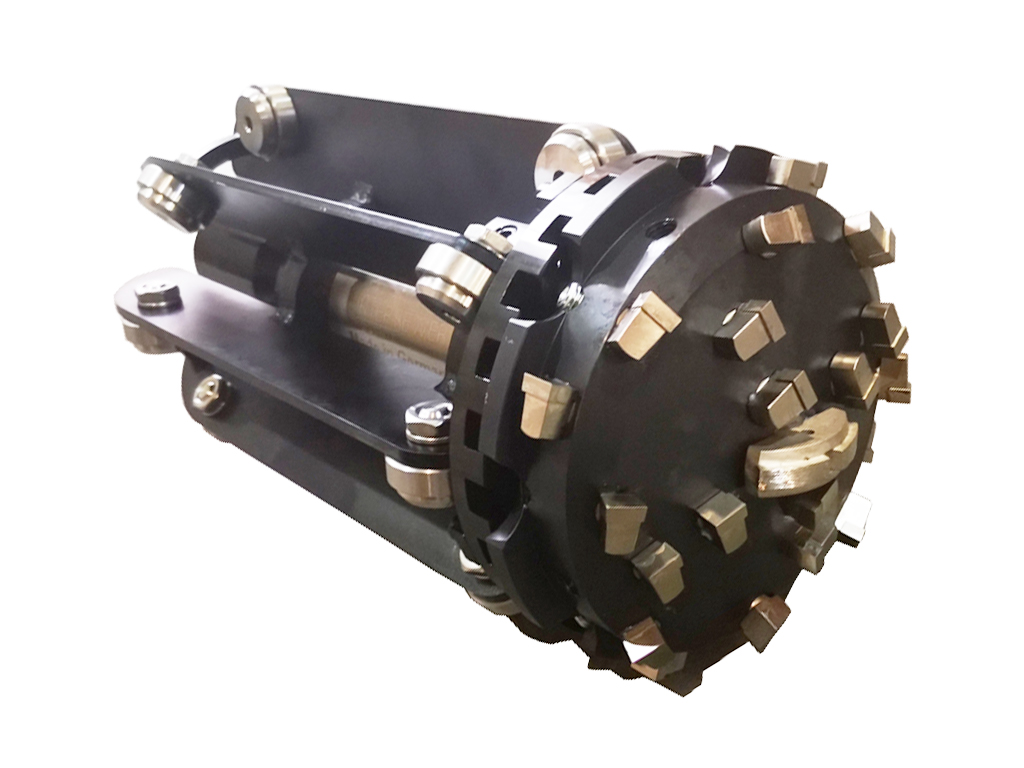 Фрезерная насадка идет в комплекте с твердосплавными сегментами должным образом прикрепленными к корпусу из нержавеющей стали, одним алмазным центровочным сверлом с охлаждающим устройством и алмазными режущими кромками. Кольцо турбины с «плавниками» не только увеличивают крутящий момент, но также обеспечивают возможность движения по прямой.